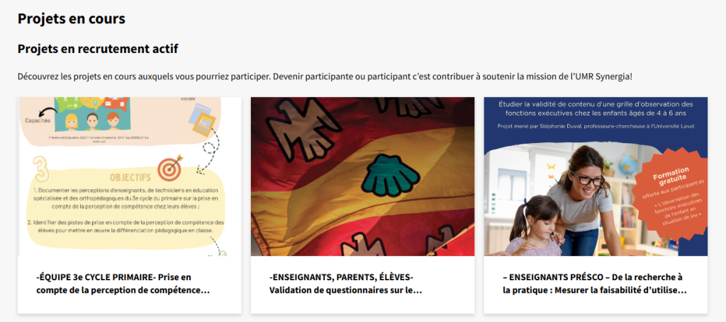 L’UMR Synergia met en oeuvre des projets qui découlent des besoins exprimés par les milieux scolaires partenaires afin de soutenir le développement professionnel continu du personnel scolaire dans le domaine de l’intervention éducative auprès des élèves présentant des difficultés d’adaptation.