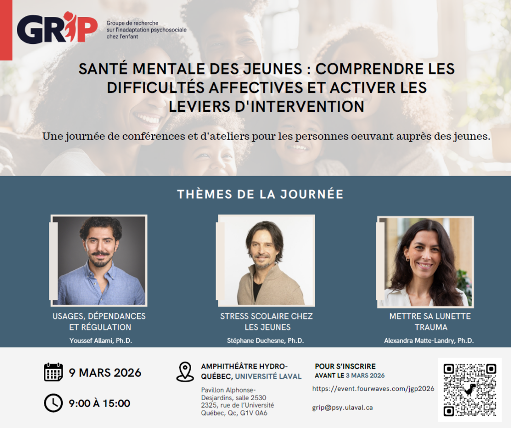 9 mars 2026Amphithéâtre Hydro-Québec, Université LavalSANTÉ MENTALE DES JEUNES : COMPRENDRE LES DIFFICULTÉS AFFECTIVES ET ACTIVER LES LEVIERS D’INTERVENTION -