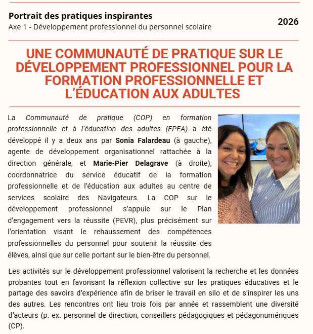 Découvrez le portrait inspirant de Sonia Falardeau, agente de développement organisationnel rattachée à la direction générale, et Marie-Pier Delagrave, coordonnatrice du service éducatif de la formation professionnelle et de l’éducation aux adultes au Centre de services scolaire des Navigateurs. Ce duo a développé il y a deux ans une Communauté de pratique (COP) en formation professionnelle et à l’éducation des adultes (FPEA) impliquant plusieurs directions d’établissement.