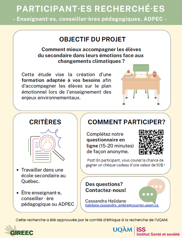 -PERSONNEL SCOLAIRE AU SECONDAIRE- Développement et évaluation d’une formation pour le personnel scolaire visant à accompagner les adolescents dans la gestion de l’écoanxiété et favoriser leur pouvoir d’agir