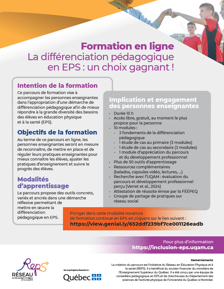 Ce parcours de développement professionnel vise à accompagner les personnes enseignantes en éducation physique et à la santé (EPS) dans l’appropriation autonome d’une démarche de différenciation pédagogique afin de mieux répondre à la grande diversité des besoins des élèves. Il offre 10 modules d’autoformation à faire en autonomie au rythme désiré par la personne. La recherche permettra de documenter le développement professionnel perçu.